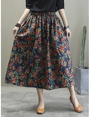 Gonna maxi da donna in lino simile Vita media Gonne Floreale Floreale Inelastica Quotidiana Vacanza Marrone Blu scuro Bianco+Blu Beige Estate Poliestere