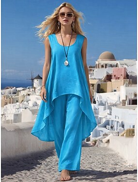 set da donna, due pezzi, finto cotone e lino, moda casual, comfort, casa, quotidiano, vacanza, lino, estate, primavera, abiti per la casa