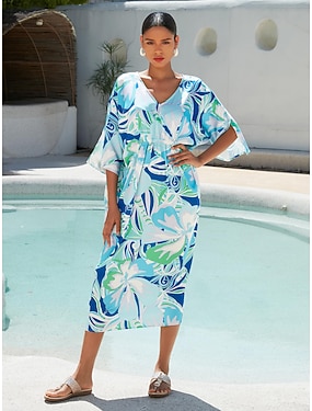 Per donna Vestito a caftano Abito stampato Abito midi Vestito longuette Blu Mezze maniche Fiore / Piante Stampa Primavera estate A V Stile da spiaggia Spiaggia XS S M