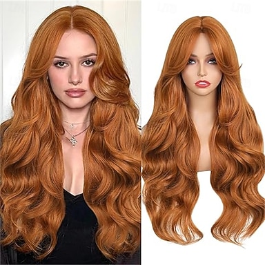 Parrucca lunga color zenzero con frangia per donna, riga libera, acconciatura a strati, sintetica, resistente al calore, per uso quotidiano e feste, 26 pollici.
