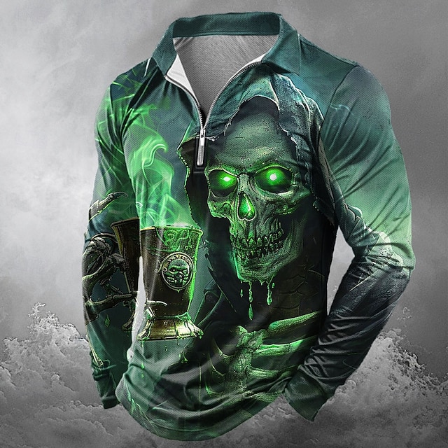 Giorno dei Morti Per uomo Teschio Teschi Polo con zip Manica Lunga Magliette polo Bavero Casual Orrore Scuro All'aperto Abito da festa Stampa 3D Primavera Autunno Inverno Rosso Blu Viola #10080265