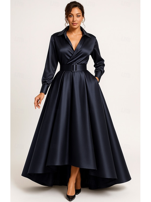 Linea ad A Asimmetrico Lunghezza al pavimento Abito da invitata a nozze Abito Formale Abito svasato Abito da cerimonia per signora Manica Lunga Colletto a Camicia Elegante Vintage Formale Raso con #10598055