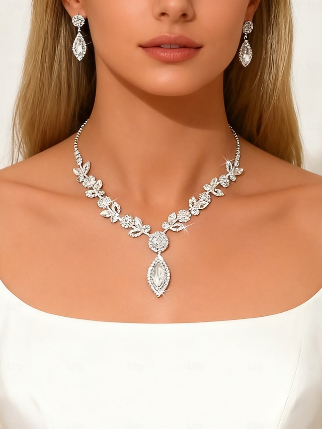 set di collana e orecchini da sposa in cristallo da donna - gioielli da sposa con design a foglia di strass scintillanti per le spose &occasioni di festa#10911647