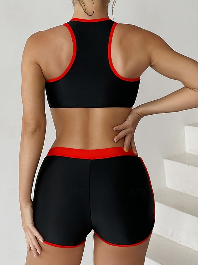 Costume da bagno due pezzi tankini da donna color block pantaloni corti schiena nuda controllo della pancia alta vita slim vacanza moda da spiaggia scollatura a U senza maniche