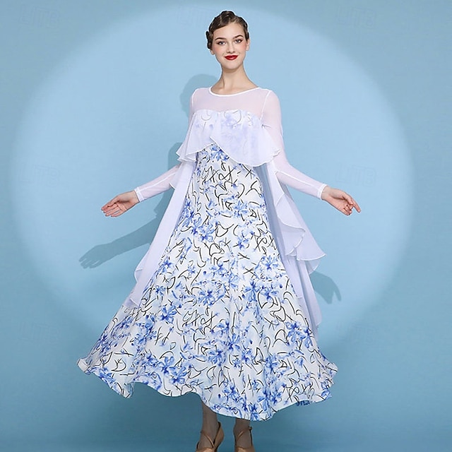 abito da ballo da sala da donna con fiori, in rete trasparente, a maniche lunghe, con volant sovrapposti, abito da competizione moderno standard, bianco e blu #11301034
