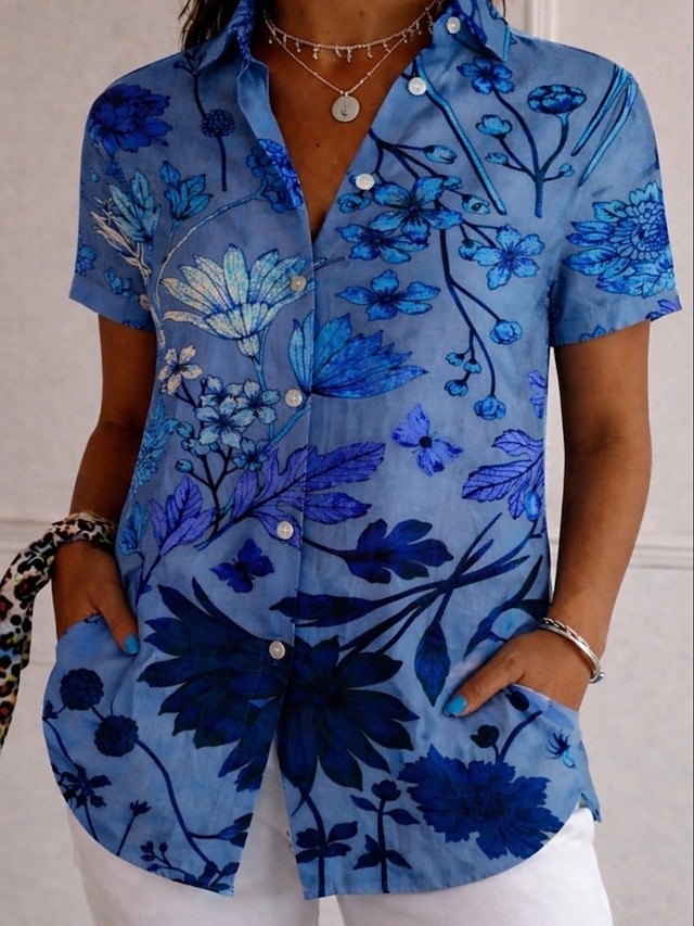 Per donna Camicia Camicia button-down Camicia casual Top estivi Bottoni Stampato Floreale Grafico Vintage Elegante Moderno Manica Corta Colletto a Camicia Top lunghi Quotidiano Blu Bianco e blu#11409337