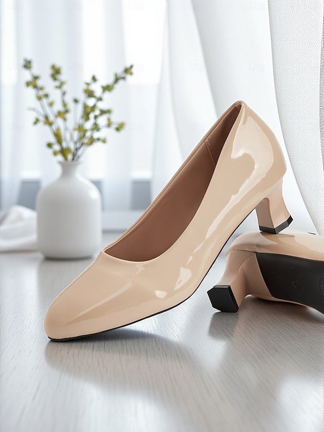 Scarpe eleganti da donna in similpelle nera verniciata con tacco medio - classiche décolleté con punta tonda per ufficio, abbigliamento business e chiesa.#11607508