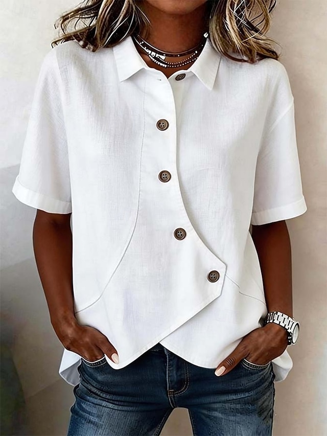 Per donna Blusa Finto cotone e lino Bottoni Tinta unica Essenziale Casual Manica Corta Colletto a Camicia Top Regolari Quotidiano Blu Bianco Albicocca Estate Primavera #12331646
