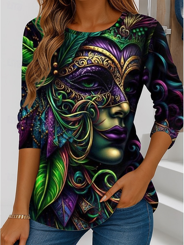 T-shirt da Donna Carnival Grafica Geometrica Vintage Elegante Classica Maniche Lunghe Collo Giro Regular Tops Stampa Quotidiana Weekend Giallo Verde Scuro Viola Primavera Autunno #12928832