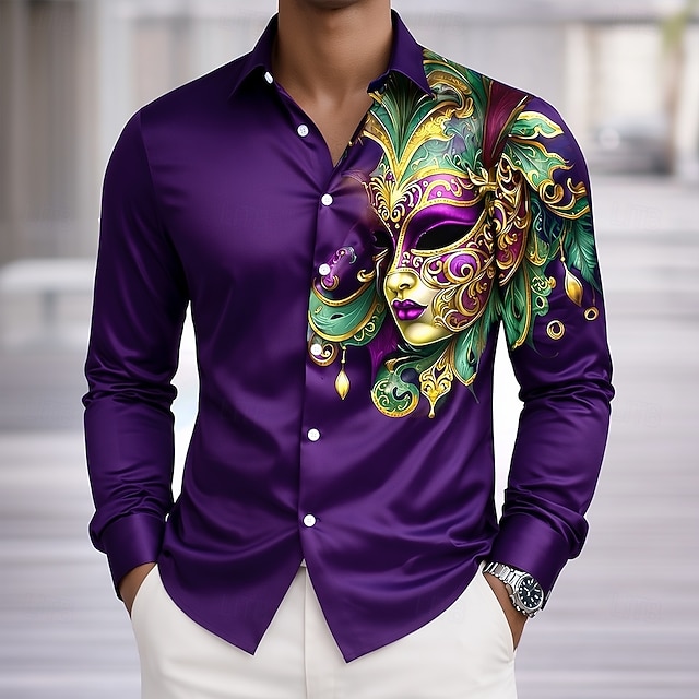 Martedì grasso Per uomo Carnevale Maschera con piume Camicia Camicia in raso Camicia elegante Manica Lunga Moda Casual Feste Ferie Estate Primavera Collo ripiegato Stampa 3D Camicie con bottoni Viola #13014653