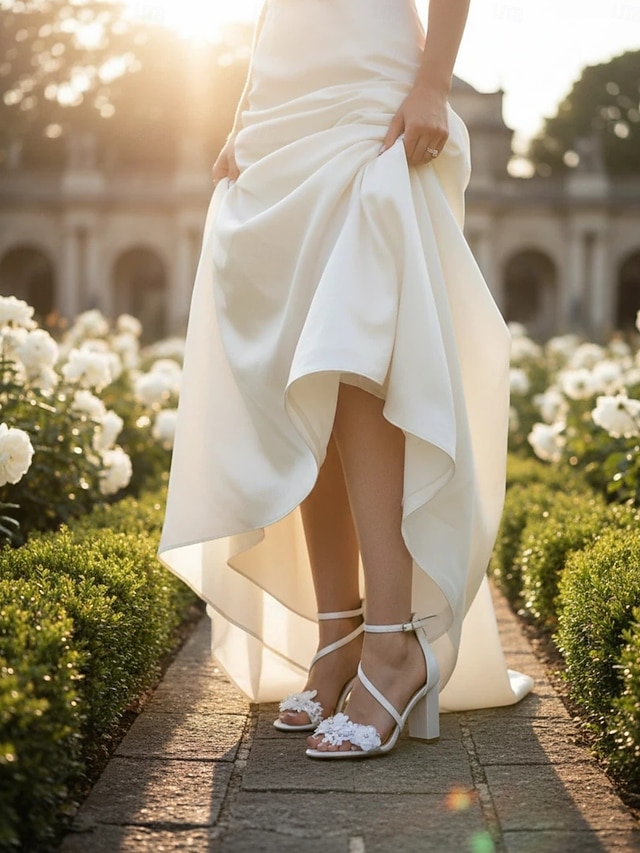 eleganti sandali da sposa bianchi con fiori – comode scarpe da sposa con tacco a blocco per cerimonie romantiche e in giardino#13311912