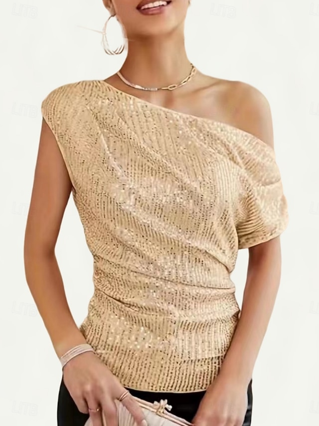 Per donna Blusa Paillettes Tinta unica Elegante Casual Manica Corta Asimmetrico Top Regolari Quotidiano Nero Bianco Viola Oro Verde Estate Primavera #13527917