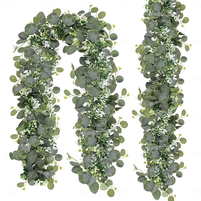4 mazzi di ghirlande di eucalipto artificiale da 5,9 piedi, ghirlande di finto dollaro d'argento, viticci con fiori bianchi, piante finte sospese in bosso per matrimoni, feste in casa, tavoli,#14139601