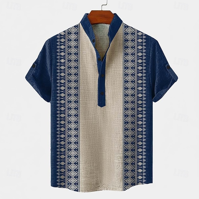 Per uomo Motivo Geometrico Tribale Etnico Camicia Camicia button-down Manica Corta Vintage Retrò Ferie Casual Quotidiano Estate Primavera Colletto Mao Colletto Henley Stampa 3D Camicia tipo lino Blu #14243752