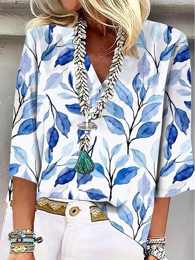 Camicia da donna a bottone giù blusa floreale vintage tropicale quotidiana a maniche 3/4 scollo a V top regolari quotidiani stampa blu estate primavera #15248838