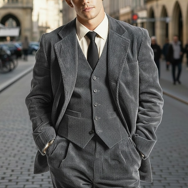 Uomo Abito in velluto a coste Casuale Affari Nero Borgogna Autunno & Inverno Tuta Bavero classico Quotidiano Affari A righe Vestibilità su misura 3 pezzi Monopetto Due Bottoni#15412824