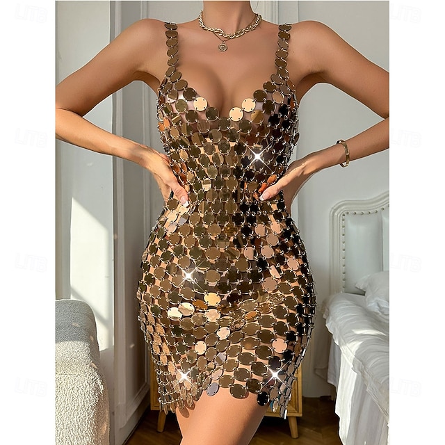Samba Dancewear Abito Mini Glam Gold Sequin Disc da Donna - Costumi da ballo Bodycon metallici scintillanti Performance da club #15628878