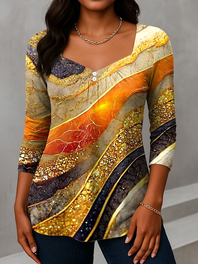 Per donna Maglietta Bottoni Stampato Ombre Grafico Vintage Moda Elegante Manica Lunga Scollo a V Collo asimmetrico Top Regolari Quotidiano Weekend Abbigliamento da vacanza Blu Giallo Viola Verde #16329357