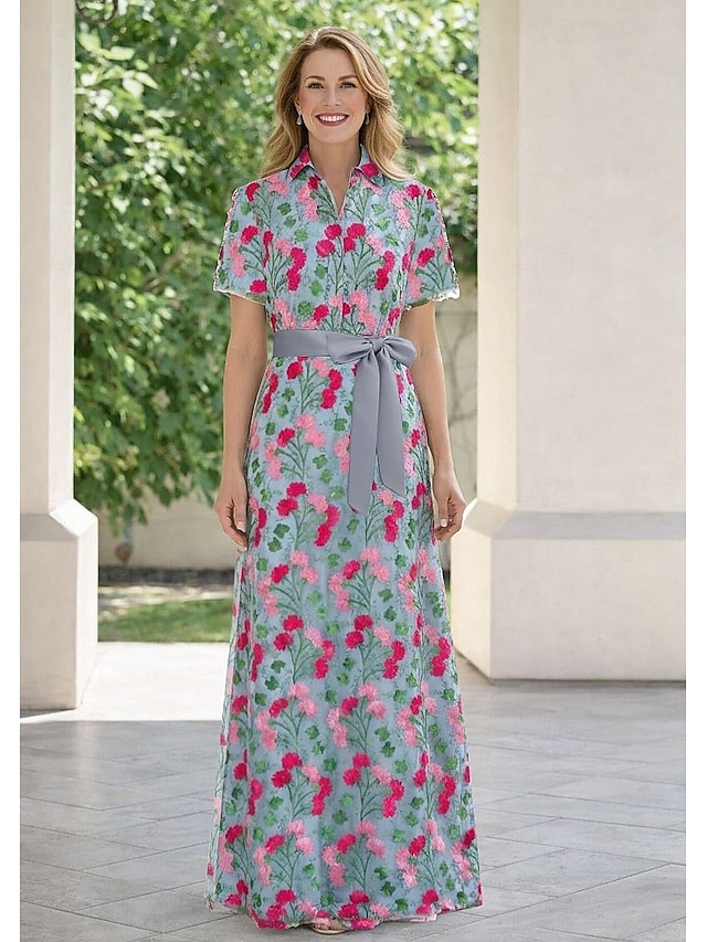 Linea ad A Lunghezza al pavimento Abito da invitata a nozze Abito da cerimonia per signora Manica Corta Colletto a Camicia Elegante Formale Derby del Kentucky Semi-Formale Pizzo con Ricamo #17301895