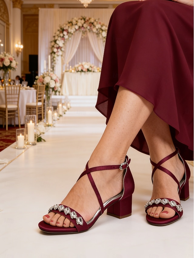 sandali da donna con tacco a blocco e strass color bordeaux - eleganti scarpe eleganti con cinturino alla caviglia per la mamma della sposa, matrimonio chic in città &eventi serali formali#17415460