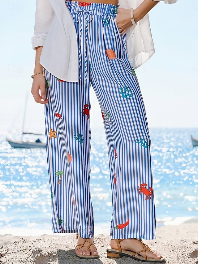 Per donna Gamba larga Chinos Vacanza Moda Streetwear Lunghezza intera Vita Alta A righe Tasca Fascia Elastica Stampato Comodo Comodità Morbido Elasticizzato All'aperto Vacanza Streetwear Blu Estate #17612682