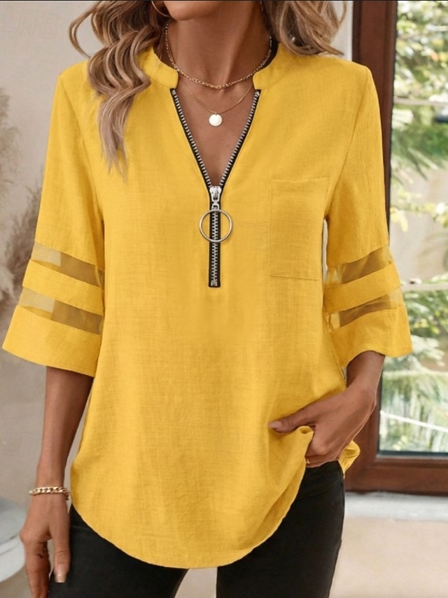 Per donna Camicia Blusa Nero Bianco Giallo Liscio A strisce Cerniera Manica a 3/4 Giornaliero Per eventi Essenziale Lavoro Informale A V S #18080708