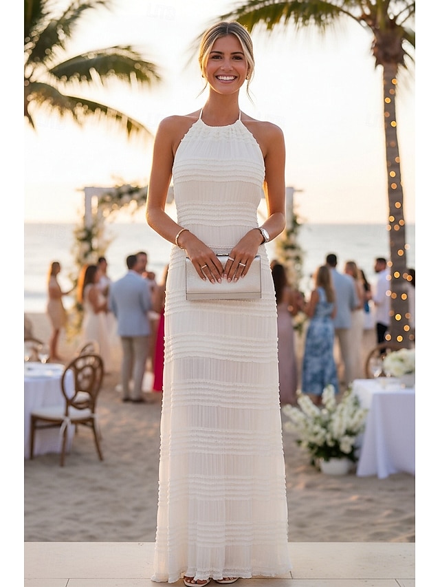 Linea ad A Lunghezza al pavimento Abito Bianco Abiti per invitati a matrimoni Elegante Senza Maniche All'americana Festa in giardino Matrimonio con Arricciato