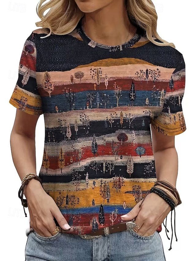 Per donna Maglietta Stampato Blocco di colori Elegante Classico Casual Manica Corta Girocollo Top Regolari Quotidiano Blu Giallo Cachi Estate Primavera Autunno Inverno #19626093