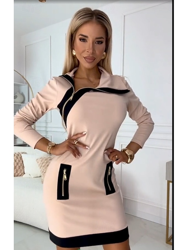 Per donna Abito a tunica Elegante Caldo Uscire Abito Autunnale Vestibilità regolare Blocco di colori Manica Lunga Collo Alto Nero Beige Autunno Inverno #19683958