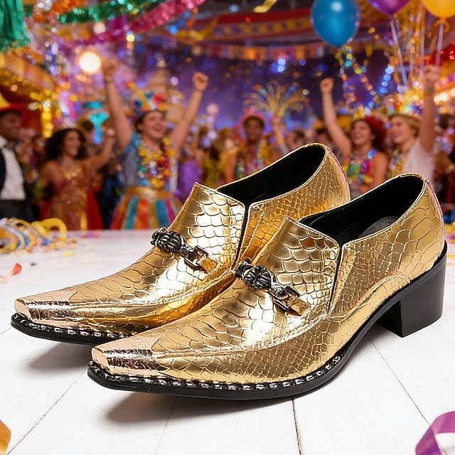 Scarpe eleganti con stampa di serpente oro di Mardi Gras per uomini – pelle di mucca premium 100% all’avanguardia design a punta per Carnevale feste e occasioni speciali#19687319