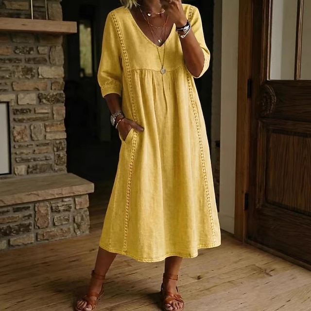 Tipo di abito:Abito a trapezio,Finto cotone e lino,Abito Estivo,Vestito Estivo,Tessuto:Cotone,Genere:Per donna,Design:Tasca,Occasione:Abito Estivo,Ufficio,Spiaggia,Quotidiano,Feste,Ferie,Stile:Spiaggia,Casual,Festa,Vacanza,Tipo di stampa:senza stampa,Taglio dell'abito:Vestibilità comoda,Tipo di lunghezza del vestito:Abito Midi,Scollatura:Scollo a V,Lunghezza della manica:Mezza Manica,Elasticità:Inelastico,Delicato:Lavaggio a macchina,Fantasia/motivo:Semplice,Stagione:Estate,Primavera,
