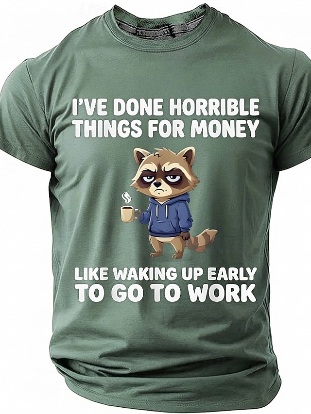 Maglietta da uomo con stampa divertente di un procione "Ho fatto cose orribili per soldi", maniche corte, girocollo, procione stanco che beve caffè, umorismo da ufficio, regalo sarcastico per#19979123