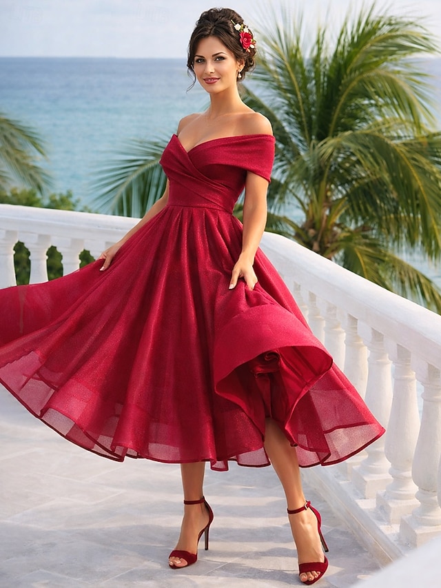 Linea ad A Lunghezza Tè Abiti da Cocktail Abiti da festa Vintage Anni 1950 Senza Maniche Senza Spalle Ospite di nozze Tulle con Pieghe #8745950