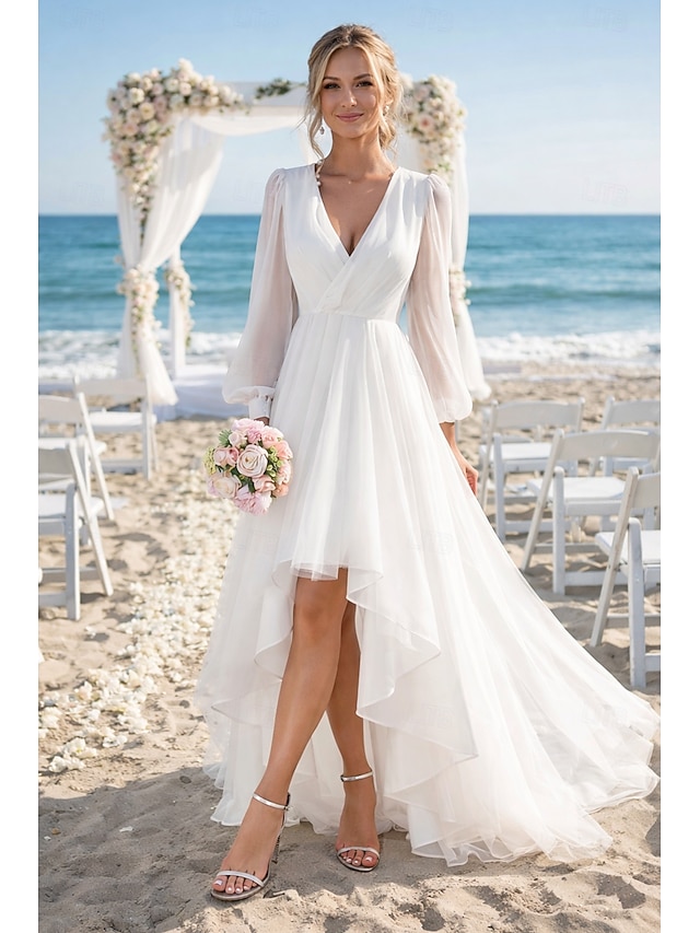 Matrimonio sulla spiaggia addio al nubilato piccolo abito bianco abiti per addio al nubilato abiti da matrimonio A-Line scollo a V manica lunga asimmetrico chiffon abiti da sposa con colore solido