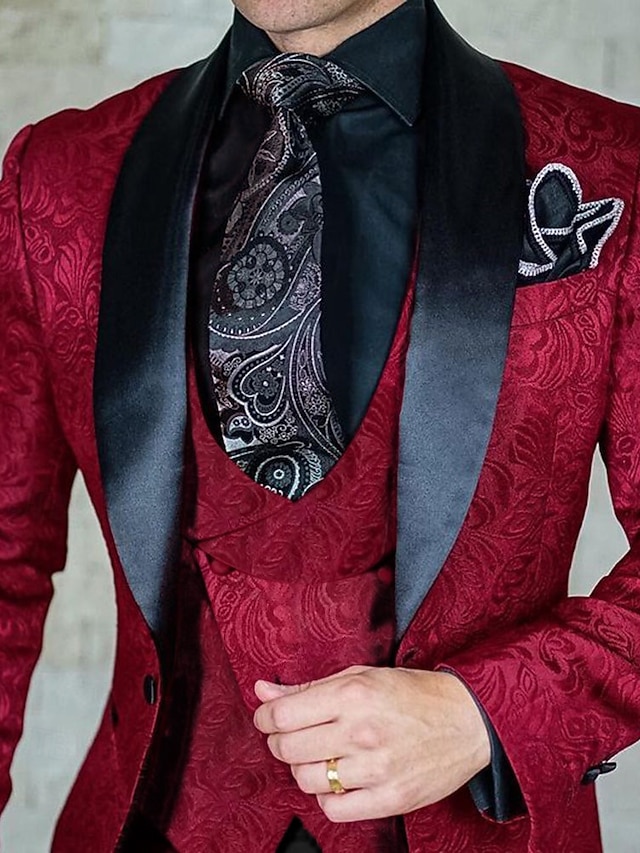 Uomo Smoking Completi Balli di fine anno Matrimonio Nero Borgogna Primavera, Autunno, Inverno, Estate Tuta Collo a scialle Jacquard Floreale Vestibilità su misura 3 pezzi Monopetto a un bottone#9636444