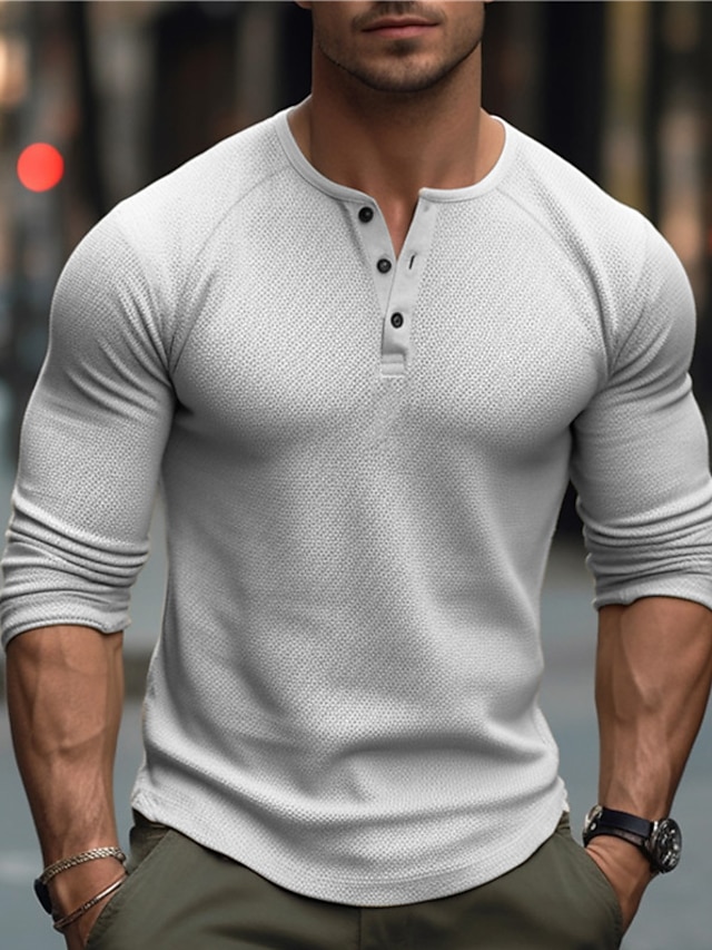 Tessuto:Poliestere,Modello top:Camicia a Maniche Lunghe,Maglietta,Maglia Henley,Maglietta,Genere:Per uomo,Occasione:Casual Quotidiano,Uscire,Streetwear,Vacanza,Stile:Essenziale,Moda,Designer,Taglio dell'abito:Vestibilità regolare,Scollatura:Henley,Lunghezza della manica:Manica Lunga,Elasticità:Micro-elastico,Delicato:Lavaggio a macchina,Lavabile,Fantasia/motivo:Semplice,Stagione:Primavera & Autunno,busto (cm):S:104;M:110;L:116;XL:122;XXL:130;XXXL:138,Lunghezza (cm):S:70;M:72;L:74;XL:76;XXL:78;XXXL:80,Fascia d'età:Adulti,Prima pagina:FF,