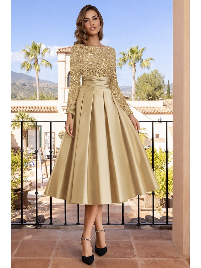 Linea ad A Lunghezza Tè Abiti da Cocktail Abiti da festa Elegante Brillanti Manica Lunga Girocollo Natale Ospite di nozze Raso Velluto con Pieghe Paillettes #9738270