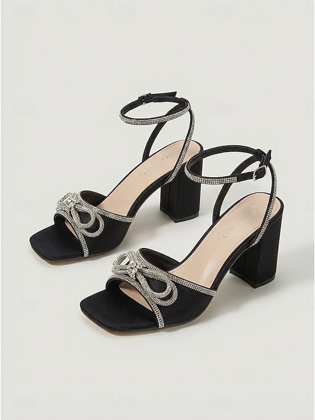 Sandali da donna neri con tacco a blocco e strass, eleganti scarpe da sera con cinturino alla caviglia e tacco grosso per cocktail party e balli di fine anno. &eventi serali #16731922