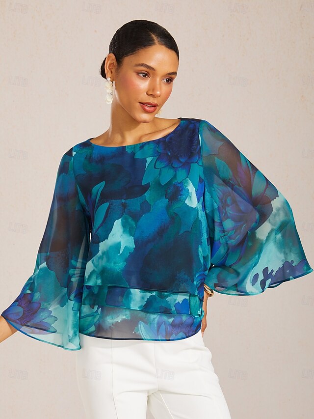 Tessuto:Chiffon,Genere:Per donna,Occasione:Casuale,Design:Floreale,Stratificato,Morbido,Stile:Elegante,Scollatura:Il giro,Scollo a Barca,Lunghezza della manica:Manica 3/4,Elasticità:Inelastico,Delicato:Lavaggio a macchina,Lavaggio a mano,Fantasia/motivo:Floreale,Paisley,Stagione:Estate,Primavera & Estate,Primavera,