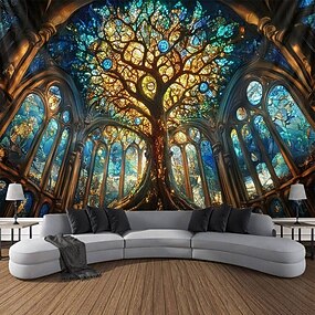 Arazzo appeso Albero della vita Arte da parete Grande arazzo Decorazione murale Fotonotizia Coperta Tenda Decorazione per casa Camera da letto Soggiorno Cattedrale in stile vetrata
