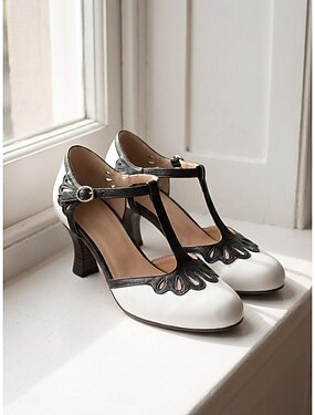 décolleté da donna con cinturino a T vintage anni '20: eleganti tacchi flapper bianchi e neri con rifiniture smerlate per feste in stile Grande Gatsby e matrimoni retrò &eventi degli anni ruggenti