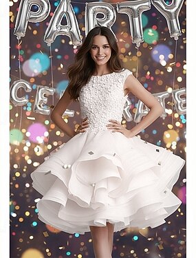 Abito da ballo Corto Mini Abiti da Ballo Anni 1950 Floreale Plissé a strati Senza Maniche Collo gioiello San Valentino Ritorno a casa Organza con Applicazioni A Strati Fiore sulla Spalla
