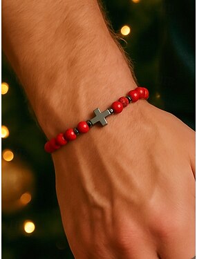 Bracciale da uomo con perline in pietra naturale e ciondolo a forma di croce, cinturino elastico regolabile, gioiello spirituale per regalo di Natale, feste e uso quotidiano