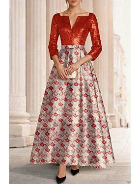 Abito da sera A-Line in oro con paillettes jacquard a motivo scallop elegante abito formale da matrimonio lunghezza fino al pavimento manica 3/4 collo quadrato con paillettes e fiocchi