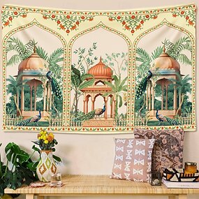Arazzo da parete vintage in stile Mughal indiano con pavone e giardino, padiglione tropicale con palme e bordo floreale, decorazione esotica da appendere per soggiorno e camera da letto, arte boho