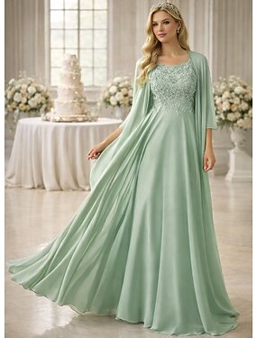 Due Pezzi Linea ad A Set di Abiti Lunghezza alla caviglia Abito da invitata a nozze Abito da cerimonia per signora Manica Lunga Girocollo Elegante Ospite di nozze Chiesa Chiffon Abiti con Giacca con