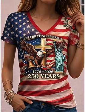 T-shirt patriottica per donne del Giorno dell'Indipendenza anniversario americano 250° stampa grafica bandiera bandiera americana vintage stilosa classica maniche corte colletto a V top regolari