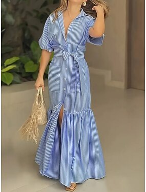 Per donna Abito maxi Vestito Casual Abito a trapezio Elegante Spiaggia Vestibilità regolare Grafico A righe Manica Corta Colletto a Camicia Blu Nero Rosa Rosso Estate Primavera