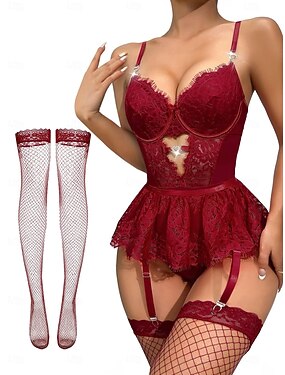 Set Babydoll Lingerie Teddy Bodysuit Collant a Rete con Accessori Donne Lingerie in Rete e Pizzo Elegante Indumento Notturno Adulti Casa Vestire Regalo di San Valentino per Lei