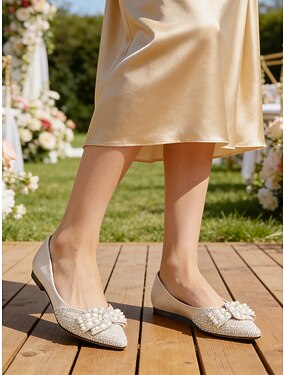 Per donna Matrimonio in giardino Perle Tacco a Blocco Punta a Punta Moda Raso Mocassino Nero Champagne